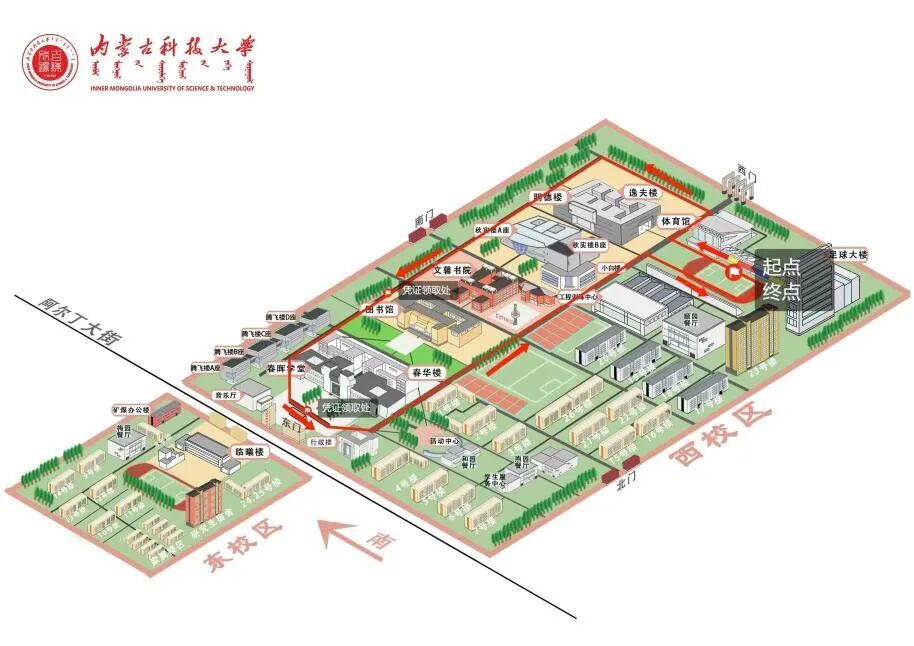 起点终点均设在主校区田径场,路线全程3公里。竞赛组参赛人员在比赛中途经图书馆南侧、春晖学堂东门广场时需两次索取凭证,活动结束后在田径场南侧持两处凭证领取纪念奖牌。